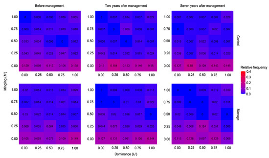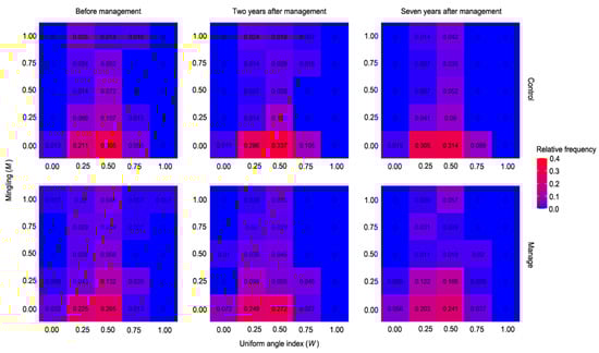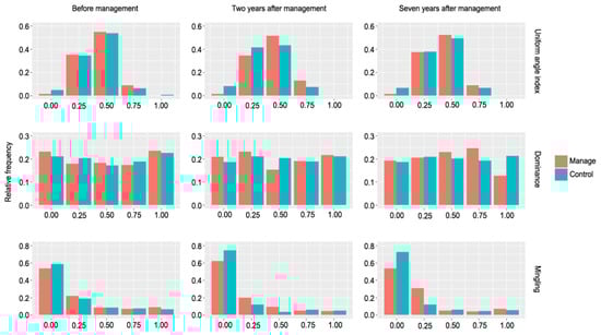 The relative frequency results confirmed that most trees in all stands showed low mixtures ( = 0.00, 0.25) in any management year, with no significant differences between the SBFM and control plots (Figure 3).