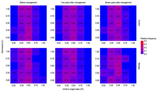 In all plots, the - bivariate distributions yielded approximately the same frequency values for each class of (0.00–1.00), whereas frequency values varied greatly among all classes (Figure 6). Most reference trees in all plots were surrounded by trees of the same species. More than 50% of trees in all plots were concentrated within the structural combination = 0.00 and = 0.00–1.00, which was evenly distributed at each level of dominance ( = 0.00–1.00). The proportion of dominant ( = 0.00, 0.25) and medium ( = 0.50) trees with a low degree of mingling ( = 0.00 and 0.25) in the SBFM plots were 0.445, 0.492, and 0.580 for management durations of 0, 2 and 7 years, respectively, whereas those in the control plots were 0.459, 0.525, and 0.517. The relative frequency of this structural combination after 7 years of management was 6.3% higher in the SBFM plots than in the control plots. The proportions of trees that had high degrees of mingling ( = 0.75, 1.00) and disadvantage ( = 1.00, 0.75) were higher in the SBFM plots (2 years, 0.064; 7 years, 0.089) than in the control plots (2 years, 0.044; 7 years, 0.062) (Figure 5).