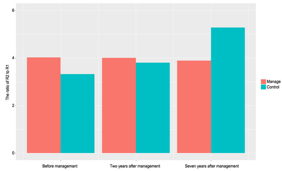 Regardless of the management treatment, the average frequency of R2 units (32.5–43.9%) was higher than that of R1 units (7.9–15.5%) (Table 3). As management duration increased, the average proportion of R2 units gradually decreased in the SBFM plots, whereas the average frequency of R1 units first decreased and then increased. However, the opposite trend was observed in the control plots, with the average proportion of R2 units first declining and then increasing and that of R1 units gradually declining over time (Table 3). The ratio of R2 units to R1 units shifted from 3.32 to 5.28 (average, ~4.00) (Figure 7). Thus, the frequency of R1 units in all plots was generally lower than that of R2 units. There were no significant differences in the frequencies of either R2 or R1 units or in the ratio of R2 units to R1 units between the SBFM and control plots.