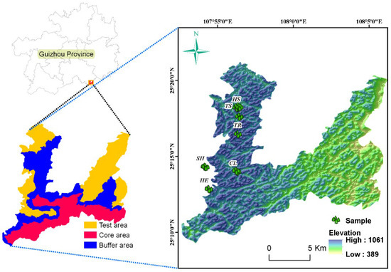 Guizhou Maolan National Nature Reserve is located in Libo County, Qiannan Buyi Miao Autonomous Prefecture, Guizhou Province. The geographical location is 107°52′10″–108°45′40″ east longitude and 25°09′20″–25°20′50″ north latitude. In our study area, the HE and SH stages are in the test area, the HS, TS, and TR stages are all in the buffer area, and the CL stage is in the core area (Figure 1). The average annual percentage of sunshine is 29%, growth period is 315 days, annual average relative humidity is 80%, and annual average temperature is 18.3 °C, consistent with the humid central subtropical monsoon climate. The main exposed rocks constituting the karst landscape in the study area are pure limestone and dolomite. The soil is predominantly black limestone with weak alkaline quality (Table 1), but the soil layer is shallow, and cover is discontinuous [35]. The majority of the reserve is a meso-subtropical native karst forest with mixed evergreen deciduous broad-leaved forests. Additionally, successional communities with different degrees of degradation are present, which are highly represented in studies on natural recovery of degraded communities [36].