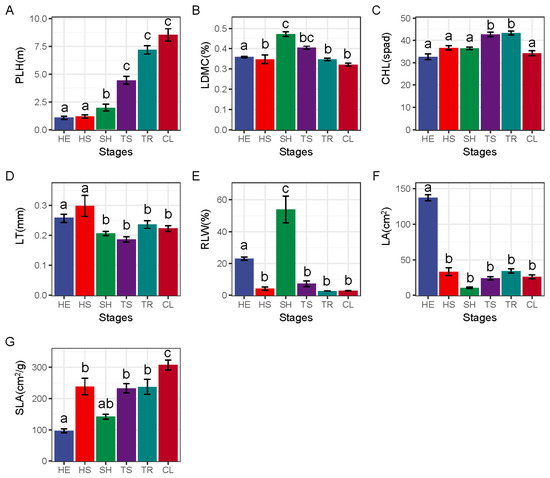 Weighted functional trait characteristics of communities at different restoration stages. CL—ultimate stage, TR—tree stage, TS—tree and shrub transition stage, SH—shrub stage, HS—grass and shrub transition stage, HE—herbaceous stage; PLH—plant height, LDMC—leaf dry matter content, CHL—chlorophyll content, LT—leaf thickness, RLW—leaf width to leaf length ratio, LA—leaf area, SLA—specific leaf area. Different lowercase letters represent significant differences, p < 0.05. The different letters of a–c represent significant differences. The change characteristics of PLH (A), LDMC (B), CHL (C), LT (D), RLW (E), LA (F) and SLA (G) in different recovery stages.