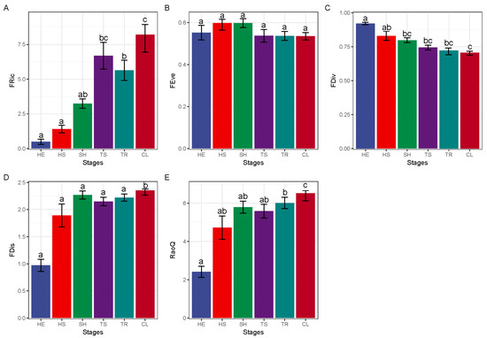 Functional diversity at different stages of recovery. FRic—functional richness index, FEve—functional evenness index, FDiv—functional divergence index, FDis—functional separation index, RaoQ—quadratic entropy coefficient; CL—ultimate stage, TR—tree stage, TS—tree and shrub transition stage, SH—shrub stage, HS—grass and shrub transition stage, HE—herbaceous stage. Different lowercase letters represent significant differences, p < 0.05. The different letters of a–c represent significant differences. The change characteristics of FRic (A), FEve (B), FDiv (C), FDis (D) and RaoQ (E) in different recovery stages.