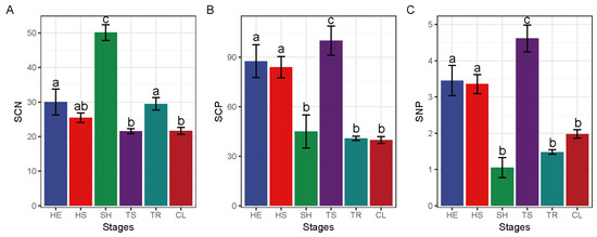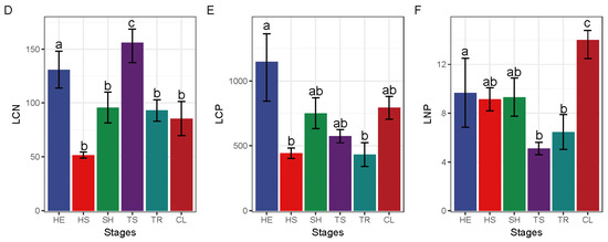 As shown in Table 3, soil organic carbon and total nitrogen contents were significantly higher in the TS and CL stages while soil total phosphorus was markedly higher in the CL stage. The highest coefficients of variation of soil C, N, and P were obtained at the HS stage, TS stages. The total nitrogen content in leaves at the HS stage was significantly higher than that at the HE stage, TS stage, and TR stage. There was no significant difference between the SH stage and CL stage. The variation coefficient of leaf carbon content was the highest in the TS stage, while the variation coefficient of leaf nitrogen and phosphorus content was the highest in the SH stage.