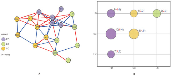 Relationship between functional diversity and leaf and soil ecological chemometric networks. SCC—soil organic carbon content, SNC—soil total nitrogen content, SPC—soil total phosphorus content, LCC—leaf organic carbon content, LNC—leaf total nitrogen content, LPC—leaf total phosphorus content, SCN—soil C:N, SCP—soil C:P, SNP—soil N:P, LCN—leaf C:N, LCP—leaf C:P, LNP—leaf N:P. In (A), The red line signifies positive correlations while the blue line represents negative correlations. FD represents functional diversity index, LC—leaf ecological stoichiometry, SC—soil chemical properties; FRic—functional richness index, FEve—functional evenness index, FDiv—functional divergence index, FDis—functional separation index, RaoQ—quadratic entropy coefficient. In (B), the red numbers inside the brackets represent the number of positive correlations and the blue numbers represent the number of negative correlations.