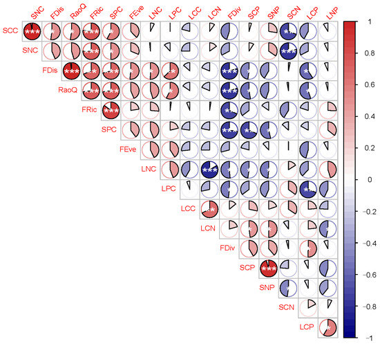 Correlations of functional diversity with leaf and soil chemical properties. SCC—soil organic carbon content, SNC—soil total nitrogen content, SPC—soil total phosphorus content, LCC—leaf organic carbon content, LNC—leaf total nitrogen content, LPC—leaf total phosphorus content, SCN—soil C:N, SCP—soil C:P, SNP—soil N:P, LCN—leaf C:N, LCP—leaf C:P, LNP—leaf N:P. FRic—Functional richness index, FEve—Functional evenness index, FDiv—Functional divergence index, FDis—Functional separation index, RaoQ—Quadratic entropy coefficient. *, p < 0.05, significant correlation; **, p < 0.01, highly significant correlation; ***, p < 0.001, highly significant correlation. The amount of colored area filled within the small circle represents the correlation size.