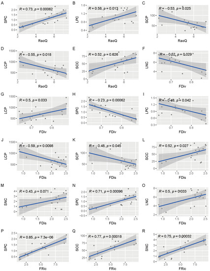 Linear plots of the correlation between functional diversity and leaf and soil properties. R represents the magnitude of correlation between the two variables, p represents the magnitude of significance, and when p ≤ 0.05, it indicates a significant correlation between the two variables. SCC—soil organic carbon content, SNC—soil total nitrogen content, SPC—soil total phosphorus content, LCC—leaf organic carbon content, LNC—leaf total nitrogen content, LPC—leaf total phosphorus content, SCN—soil C:N, SCP—soil C:P, SNP—soil N:P, LCN—leaf C:N, LCP—leaf C:P, LNP—leaf N:P, FRic—functional richness index, FEve—functional evenness index, FDiv—functional divergence index, FDis—functional separation index, RaoQ—quadratic entropy coefficient. The linear relationship between RaoQ with SPC (A), LPC (B), SCP (C), LCP (D) and SCC (E); The linear relationship between FDiv with LNC (F), LCP (G), SPC (H) and LPC (I); The linear relationship between FDis with LCP (J), SCP (K), SCC (L), SNC (M), SPC (N) and LNC (O); The linear relationship between FRic with SPC (P), SCC (Q) and SNC (R).