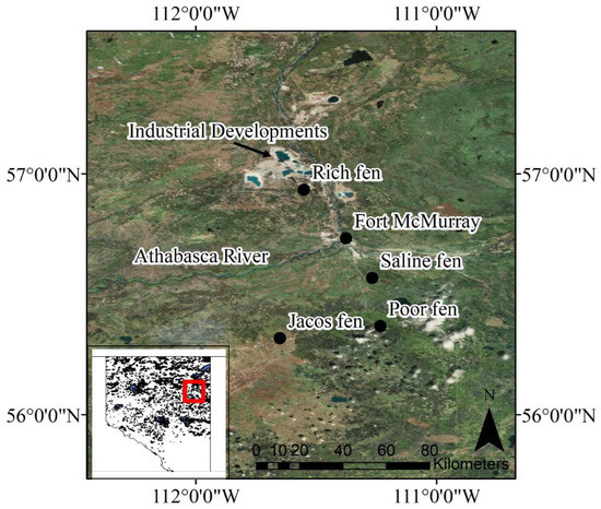 The nutrient-rich fen site (Rich fen) is located within the larger Poplar Creek Fen, ~7 km northwest of the active oil sands development hub, near Fort McMurray, CA (56°56′ N, 111°33′ W). The site sits next to a pipeline right-of-way, that was decommissioned over 12 years ago, leading to a slight modification in site hydrology. A previous study on the site reported that the vegetation cover is dominated by Larix laricina (larch), Betula glandulosa (dwarf birch), Equisetum fluviatile (swamp horsetail), Smilacena trifolia (three-leaved Soloman’s-seal), Carex spp. and moss including Polytrichum spp., Tomenthypnum spp. and Sphagnum spp. [17]. The hyper-saline fen (Saline fen) is least impacted site, located approximately 40 km south of the industrial hub (56°34′ N, 111°16′ W). The site is characterized by a sharp transition from the nutrient-rich saline fen to a nutrient-poor treed fen. Detailed descriptions have been previously reported [28,29,30]. Peat and vegetation samples from this study site were collected in the rich-poor fen transition zone under dominant vascular species cover, such as Triglochin maritima (Seaside arrowgrass), and Juncus balticus in the Saline portion, Ledum rhododendrum (Labrador tea), Rubus chamaemorus (cloudberry), and Vaccinium oxycoccos (cranberry) in the poor fen portion. Some of bryophytes found on the site include Sphagnum fuscum, S. capillifolium and Cladonia mitis (green reindeer lichen) (A. Borkenhagen, Unpublished). First nutrient-poor fen (Poor fen) is situated on a local topographic high (Stony Mountain ~740 masl), about 62 km south of the industrial hub (56°22′ N, 111°14′ W). The hydrology of this site was impacted by a road construction that occurred over 30 years ago. Vegetation cover within the fen is dominated by Sphagnum spp. (e.g., S. capillifolium, S. agustifolium and S. magellanicum). Additionally, present in abundance are sedges (e.g., Carex aquatilis and C. limosa) and ericaceous shrubs (Betula glandulosa, Oxycoccus microcarpus, Chamaedaphne calyculata, and Andromeda polifolia), with a discontinuous tree cover that is dominated by stunted Picea mariana and some Larix laricina [31,32].