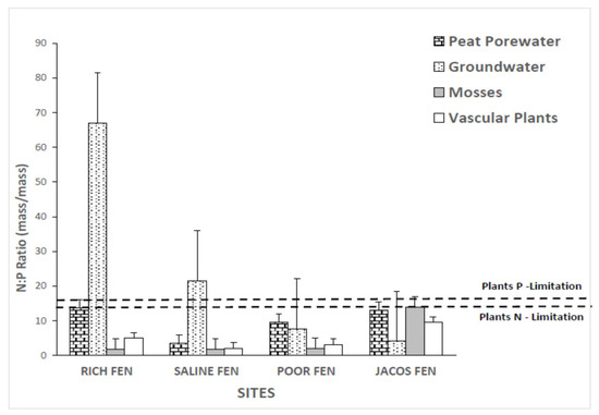 Results from our study also show that the TN:TP ratios of peat (Table 2) are not reflected in either the N:P ratios in bio-available pools or plant tissues in these peatlands (Figure 2). Indeed, the total P stored in peat represents the various organic and inorganic forms of P that may be unavailable to plants [45]. This imbalance in N:P ratio between the bioavailable nutrient pools and the long-term stores in peat supports the hypothesis that the availability of P is dependent on geochemistry of the site [27,28]. Thus, a disturbance that modifies the geochemistry of peat could potentially lead to an imbalance in the ratio of essential plant nutrients.