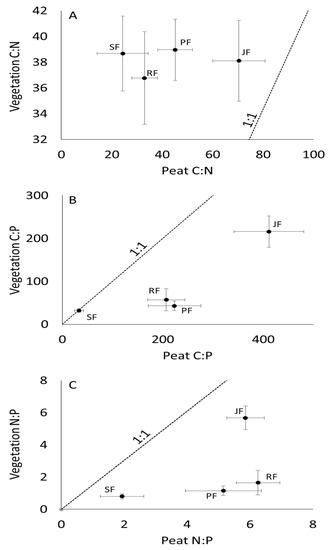 Resource and organism stoichiometry in (A) C:N, (B) N:P, and (C) C:P (all as g g−1) across the four study sites (saline fen, SF; rich fen, RF; poor fen, PF; and Jacos fen, JF). C:N, N:P, and C:P ratios display a homeostatic trend across the four sites as per the approach of Sterner and Elser (2002), given that the strengthen of the relationship was not significant (p > 0.05 throughout). Points and error bars are the mean and one standard deviation of 24 peat and 9 vegetation samples per site.