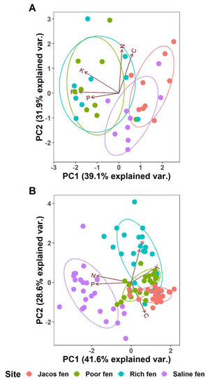 A principal component analysis (PC) revealed clear separation in the chemical composition of plants between the JACOS fen (the recently impacted poor fen) and the other older impacted Poor fen (Figure 4a). The difference between JACOS fen and the other Poor fen is found almost entirely along the PC1 axis, dominated by variation in total Fe (r = −0.65) and P (r = −0.45) concentrations. In contrast, the JACOS fen was not distinct from the other sites in PC space of peat chemical data (Figure 4b), showing overlap with both the Poor and Rich fens. Instead, the Saline fen was distinct from the three other fens, separated by PC1 values, which are closely associated with total N (r = −0.61) and P (r = −0.62) concentrations.