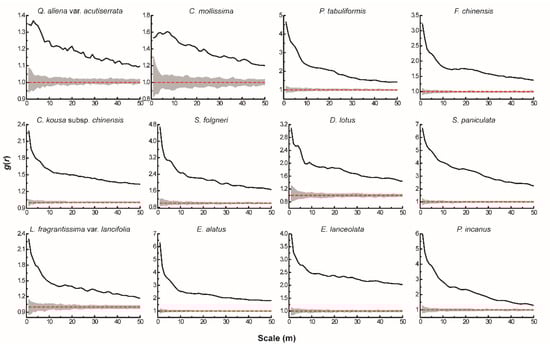Spatial distribution pattern of dominant tree species under CSR. The solid black line indicates the observed value of g(r), the red dashed line indicates the theoretical value of g(r). The gray area indicates the 99% confidence interval. The solid black line above the confidence interval indicates aggregation distribution, the solid black line below the confidence interval indicates uniform distribution, and the solid black line between the confidence intervals indicates random distribution.