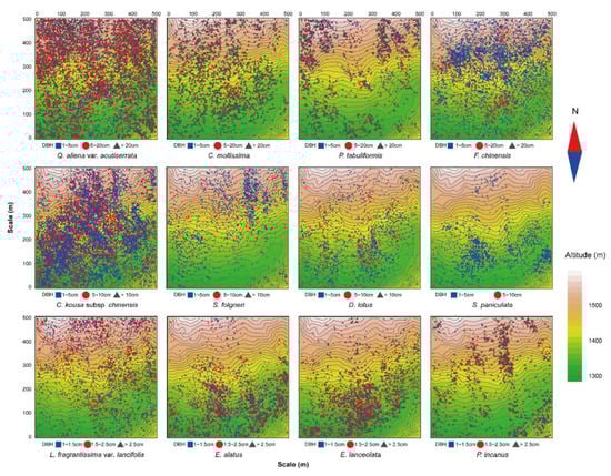 Although there is an existing knowledge base, revealing the mechanisms behind species distribution patterns remains a considerable challenge as different processes, such as species interactions and environmental factors, can contribute differently to form similar patterns. The Qinling Mountains are the dividing line between China’s subtropical and warm temperate zones, with a warm temperate semi-humid climate to the north and a humid subtropical climate to the south, making it the most important geographical-ecological transition zone in China. With its high species richness and unique species composition, the Qinling Mountains are irreplaceable for their role in supporting China’s biodiversity and ecosystem functioning [27]. However, ecological studies related to tree populations and community patterns based on a large plot are urgently needed in the transition zone region. In that context, the main objective of this study was to determine the intra-species spatial distribution and inter-species associations of 12 dominant tree species in this forest. Specifically, our study addressed the following questions: (a) What are the spatial distribution patterns of the dominant tree species? Are the distribution patterns of dominant species consistent across the tree, sub-arbor, and shrub layers? (b) What are the intraspecific and interspecific associations between different life-history stages? (c) How do topographic factors (elevation, slope, and convexity) affect the spatial distribution of dominant tree species in the forest?