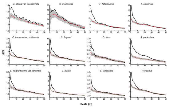 Intraspecific associations of dominant tree species under CSR. The solid black line indicates the observed value of g12(r), the red dashed line indicates the theoretical value of g12(r). The gray area indicates the 99% confidence interval. The solid black line above the confidence interval indicates a positive association, the solid black line below the confidence interval indicates a negative association, and the solid black line between the confidence intervals indicates no association.