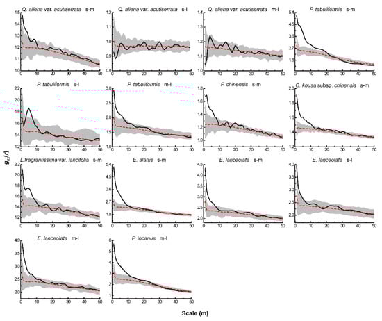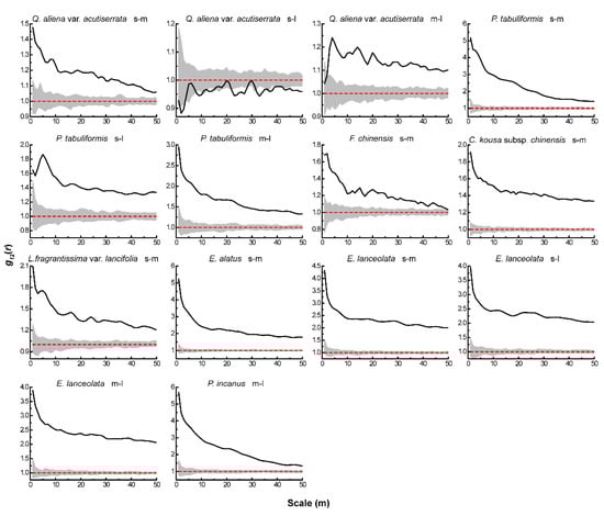 We analyzed the spatial distribution using point process theory [32]. We chose complete spatial randomness (CSR) and heterogeneous Poisson (HP) as the null models [33], where the null hypothesis of CSR was that each point would be independent of all others, occur with equal probability at any location within the sample, and demonstrate a distribution not influenced by any other organism or abiotic; the null hypothesis of HP, meanwhile, simulated the distribution of individuals according to the density function. In this study, we chose the standard deviation sigma = 15 to eliminate the habitat heterogeneity effect [34,35,36]. The spatial distribution pattern of each dominant tree species was analyzed by univariate g(r) function: , where r is the spatial scale (m), the K(r) function is the ratio of the expected number of points to the density of sample points in a circle with any point in the study area as its center, and r is the radius. Here, g(r) > 1 indicates aggregation and g(r) < 1 indicates aggregation at scale r.