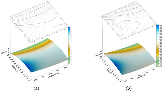 It can be seen the relative trends of each trait from the trend surface diagram (Figure 2) that the geographic variation trends of the four growth traits (GD, H, C, and Bio) were similar, with the boundary around 38 °N, and the growth traits generally showed a decreasing trend from west to east in the southern region (influenced by longitude more than latitude). However, the northern area shows a decreasing trend from south to north (mainly affected by latitude, but not much by longitude). CP showed an increasing variation trend from southwest to northeast (more affected by latitude than longitude) and EE showed a trend of increasing first and then decreasing from southwest to northeast (more affected by latitude than longitude).