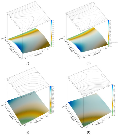 Power contour-trend surfaces for the GD (a), H (b), C (c), Bio (d), CP (e), and EE (f) of B. papyrifera. The surface represents the geographic variation and the lines upon the surface represent the contours.