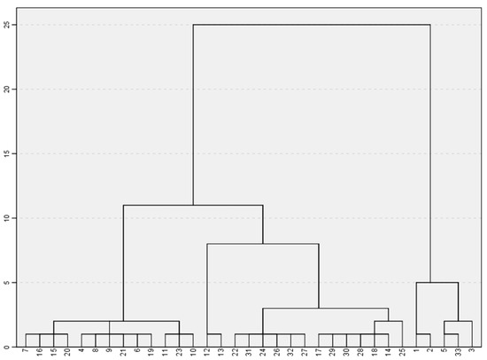 The growth and nutritional traits were used to perform cluster analysis on paper mulberry using the SPSS 19 software, and the results are shown in Figure 3. The threshold was 6, and the 33 paper mulberry provenances were divided into four categories. The first category contains two provenances from southwest China, Mianyang, Sichuan and Kaizhou, Chongqing. This group has the highest leaf biomass and high crude protein. The second category is mainly from the southern and southwestern regions, including Ganzhou in Jiangxi, Yichang in Hubei, Nanchong in Sichuan, Baise in Guangxi, Pu’er in Yunnan, Guangzhou in Guangdong, Dayi in Sichuan, Liuzhou in Guangxi, Yunfu in Guangdong, Panzhou in Guizhou, Huangping in Guizhou, Ping in Guangxi Xiang, and Guizhou Zunyi. This group has low protein content and large leaf biomass. The third group is mainly from the northern and southeastern regions, including Tongbai in Henan, Nanping in Fujian, Shanghai, Xiangxi in Hunan, Tianshui in Gansu, Nanchang in Jiangxi, Huaibei in Anhui, Zhengzhou in Henan, Qingdao in Shandong, Jingdezhen in Jiangxi, Shashi in Hubei, Hangzhou in Zhejiang and Xi’an in Shaanxi Province. The crude protein content of this group was higher and the leaf biomass was lower. The fourth group is mainly from northern provenances, including Wu’an in Hebei, Danzhou in Hainan, Yuncheng in Shanxi, Yangquan in Shanxi, and Beijing. This group has medium crude protein and the smallest leaf biomass.