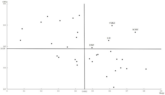 From the perspective of feed raw material production, the breeding of high-quality varieties is carried out and the main goal of breeding is to select excellent provenances with fast growth, large biomass, and high protein content. In the selection of excellent provenances for high-yield and high-quality feeds, leaf biomass and crude protein content can be considered selection indicators. In this paper, the overall average leaf biomass and crude protein content (0.4662 kg and 14.39%, respectively) were used as the threshold for the selection of superior provenances.