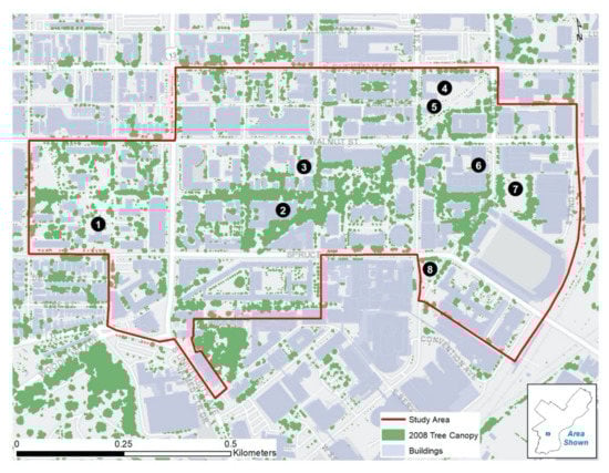 Using a case study approach, we investigated the phenomena of urban tree mortality in-depth in a real-world context [50]. As a group of co-authors, we are all current or former students or staff at Penn—a mix of scholars and landscape professionals, representing transdisciplinary research that has been called for in urban forestry [51,52].
