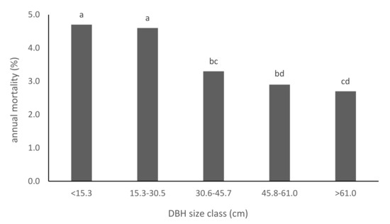 Annual mortality rates by DBH size class. Classes with the same letter are not significantly different.