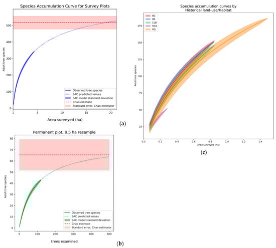 Species accumulation curves (SACs): (a) SAC for entirety of study, with all land uses combined. Dotted line is the estimated number of species using a Chao estimator, with one standard error. (b) SAC for single 0.5 hectare permanent plot. Dotted line is the estimated number of species using a Chao estimator, with one standard error. (c) SAC for entirety of study, itemized by land-use/habitat type. See Section 2.2.1 for explanation of land-use/habitat abbreviations.