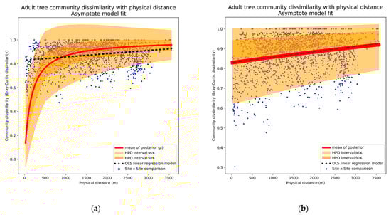 Community turnover and community dissimilarity models. Blue points represent Bray–Curtis dissimilarities between tree communities among all 61 sites, with increasing physical distance between sites being compared. Two approaches are considered, an asymptotic model and a simple linear model. (a) Bayesian, asymptotic (Michaelis–Menten) model fit. In this model, the function of the mean community dissimilarity value of zero was enforced when comparing sites that were nearly zero meters apart, and asymptotically approached complete dissimilarity (Bray–Curtis dissimilarity = 1). For comparison, the classical ordinary-least-squares fit is also given (black dashed line). (b) Bayesian linear model fit.