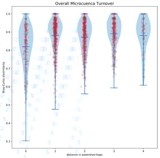 Turnover in tree communities was modeled and visualized using the Bray–Curtis dissimilarity [,] as a function of (1) physical distance or (2) watershed crossings mapped at a small scale. The Bray–Curtis dissimilarities and physical distance matrices among subplots were calculated using the SciPy spatial submodule []. Bayesian models of community dissimilarity decay were conducted using PyMC3 package in Python, with visualizations created using the companion ArViz package [].