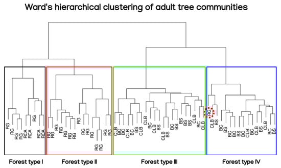 To understand the current types of forests present at Los Cedros, adult tree community data from all sites were partitioned into clusters using Ward’s minimum variance clustering [] using the Bray–Curtis dissimilarity, as implemented in the hclust command in the Vegan package in R. The number of clusters was decided by eye from the resulting dendrogram while taking into consideration the branch lengths and meaningful ecological groups.