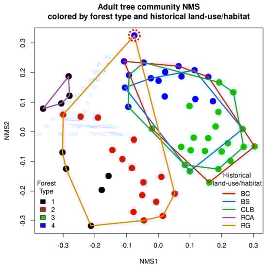 Structuring in adult tree communities as a function of historical land use/habitat was visualized using the Bray–Curtis dissimilarity and nonmetric multidimensional scaling (NMDS) (Legendre and Legendre, 2012) with the metaMDS function in the Vegan package in R.