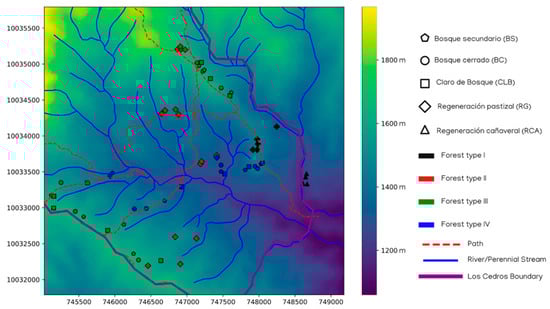 Except where otherwise noted, geospatial data were explored and visualized using tools from GeoPandas (version 0.8.1, https://geopandas.org, accessed on 31 April 2022), Rasterio (version 1.1.8, https://rasterio.readthedocs.io, accessed on 31 April 2022), and QGIS (QGIS v3.4.11-Madeira, OSGEO v3.7.1). Several environmental variables were generated using ASTER Global Digital Elevation Map version 2, including slope, aspect, elevation, eastern and northern exposures, and distance to nearest stream of all subplots. Stream data were digitized using Map CT-NII-C3-d of Bosque Protector Los Cedros from the Ecuadorian Instituto Geográfica Militar. Rasters of slope and aspect were generated with the Raster Terrain Analysis tool suite in QGIS.