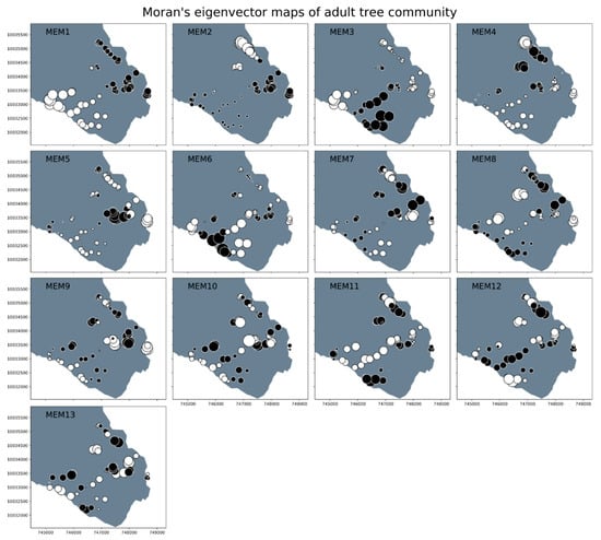 To determine important spatial scales on which the tree community was changing, and to give shape to possible spatial structuring of the tree community, Moran’s eigenvector maps (MEMs) were constructed [] by following examples as found in documentation for the ADEspatial package (https://cran.r-project.org/web/packages/adespatial/vignettes/tutorial.html, accessed on 1 August 2020). A spatially weighted neighborhood matrix of sample sites was constructed using a Gabriel connectivity matrix with an inverse distance weighting. Abundances of our adult tree community matrix were Hellinger-transformed [], and new PCA axes of the transformed were determined with the dudi.pca command in the ade4 package. Important MEMs were then selected based on their statistical significance as explanatory terms in a linear model, with the four most important tree community PCA axes as the response variables. Important MEMS were determined using a forward model-selection process, as implemented with the mem.select command in the adespatial package. The default cutoff of alpha = 0.05 was used to decide the statistical significance of MEMs. All available environmental variables were checked for correlations with MEMs using standard linear regression, as implemented in the linregress function in the Python SciPy Stats package. Correction for multiple testing was done with a Benjamini–Hochberg correction, as implemented in the multipletests command in the Python Statsmodels package. For exploratory purposes, the false discovery rate was set at FDR = 0.1.