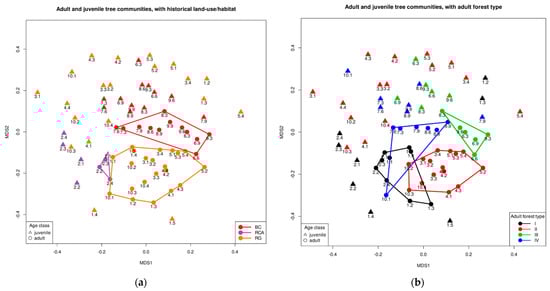 Samples that did not receive sufficient identification to confidently conclude that the sample was indeed a juvenile tree were discarded from the analysis. This selection was done using automated and manual queries of growth form data requested from the TRY database [], manual checks of the Encyclopedia of Life [], and the Smithsonian Tropical Research collections site (https://stricollections.org/portal/index.php, accessed on 1 October 2020). The Gentry manual [] was also frequently consulted. Exact species information was often not available, and the designation of juvenile tree status was made using genus growth form data where possible. Juvenile tree communities were compared to adult trees by subsetting adult tree community data to just those sites with juvenile data and combining community matrices from both. These were then ordinated using the Bray–Curtis dissimilarity and nonmetric multidimensional scaling (NMS) via the metaMDS function in the Vegan package in R.