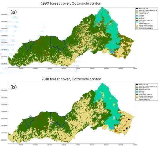 To understand the extractive pressure in the region of Los Cedros, as well as the efficacy of Los Cedros as a conservation project, we examined land-cover changes from 1990 to 2018. Data on changing land cover were accessed from the Ecuadorian Ministerio del Ambiente’s (“MAE”) interactive map and GIS catalogue, using the “Cobertura vegetal” layers from 1990 and 2018 (available at https://gis-sigde.maps.arcgis.com/apps/webappviewer/idex.html?id=8b53f9388c034b5e8e3147f03583d7ec&fbclid=IwAR2XobS46Szpz4A7IGroPuLCZh5GSJC, accessed on 10 April 2021). Vector data from the MAE were rasterized to a pixel resolution of 30 m2 using the gdal_rasterize program in the GDAL tool suite of the OSGeo project [] and visualized in Matplotlib using the rasterio package. Background deforestation rates were constrained to the Cotacachi canton of the Imbabura province, in which Los Cedros is located. Deforestation rates in the similarly-sized, nearby Bosque Protector el Chontal were quantified for comparison with Los Cedros. BP Chontal is managed by the Cattlemen’s Association of the nearby town of Brillasol (pers comm. Jose DeCoux). Administrative boundaries of BP Los Cedros and BP Chontal were supplied using the official boundary layer “Bosque y Vegetación protectora”, also available at MAE’s interactive map website.