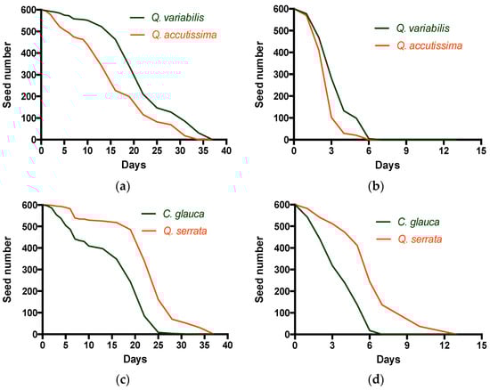 Field acorn removal of Q. variabilis and Q. accutissima (a,b), and Q. serrata and C. glauca (c,d) in the non-masting year.