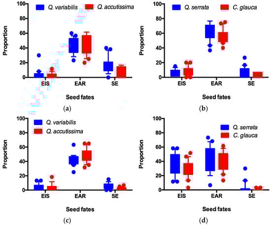 Seed fates of Q. variabilis and Q. accutissima (a), Q. serrata and C. glauca in a masting year (b) as well as Q. variabilis and Q. accutissima (c), Q. serrata and C. glauca in a non-masting year (d). EIS, EAR, and SE indicate acorns eaten in situ, eaten after removal, and seedling establishment from the released acorns, respectively.