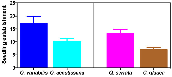 Seedling establishment from artificial caches of Q. variabilis, Q. accutissima, Q. serrata, and C. glauca. Bars sharing different letters indicate statistically significant at p < 0.05 level.