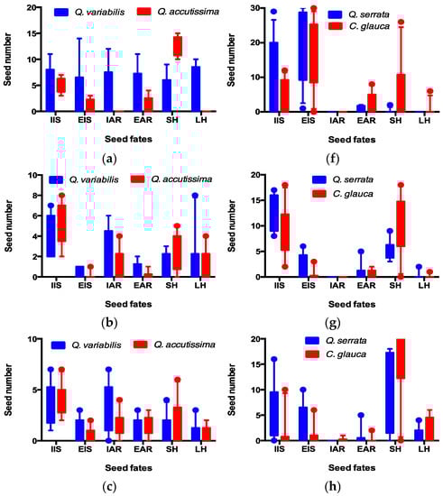 Seed fates of Q. variabilis and Q. accutissima (a–e), as well as Q. serrata and C. glauca (f–j) manipulated by Leopoldamys edwardsi, Apodemus draco, A. chevrieri, Niviventer confucianus, and N. fulvescens, respectively. IIS, EIS, IAR, EAR, SH, and LH indicate acorns intact in situ, eaten in situ, intact after removal, eaten after removal, scatter-hoarded, and larder-hoarded, respectively.
