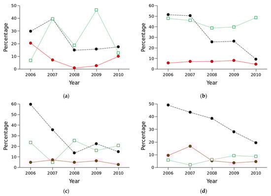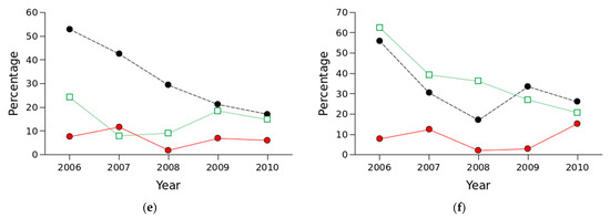 Total parasitism (full red line), total other mortality (dashed black line), and leaf damage inflicted by C. ohridella larvae (dotted green line, open squares) at six sites in the Czech Republic from 2006 to 2010. (a) Praha; (b) Plzeň; (c) Liberec; (d) České Budějovice; (e) Brno; (f) Rožnov pod Radhoštěm.
