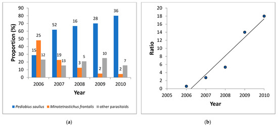 There was an obvious increase in P. saulius proportion in the parasitoid complex during the five years of observation, while M. frontalis became less abundant (Figure 3b). A Spearman correlation analysis revealed that the P. saulius/M. frontalis ratio clearly increased over time (rs = 1; n = 5; p < 0.001).