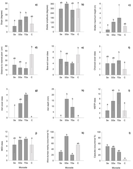 Short saplings in CM1 occupied microsites that differed from vacant microsites in several features, including slope, shelter dimensions, proximity to other plants, small-shrub cover, ash and charcoal abundances, and soil traits. Consistent patterns were detected across plantations (SSa vs. control; Figure 3), despite the geographical and management differences (Table 1).