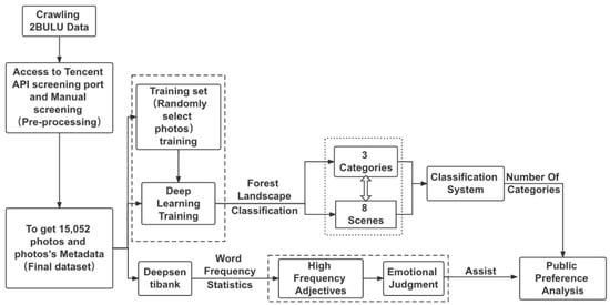 Existing studies have mostly explored preferences by using all landscape elements or images of the destination as research themes, and by default, the photos taken by people are their preferences. Thus, we use deep learning and Deepsentibank to analyze the image content with the core problem of “how to explore people’s preference of forest landscape through photos posted on UGC platforms”. That is to say, the exploration preference also supplements the sentiment analysis of pictures, aiming to make up for the lack of special research on forest landscape preference and try new angles and methods to discover valuable information from the photos published by people for forest tourism research. The specific objectives are: (1) Through data mining of outdoor website—2BULU (https://www.2bulu.com/ accessed on 1 December 2021)—a dataset of 15,052 photos of forest plants from six places in China, including Kanas, Gongga, Four Girls Mountains, Shennongjia, Changbai Mountain and Moganshan, was established, and through computer depth science, the photo visual content of the data was divided into eight scenes and three categories to determine the Chinese forest recreationists preference for forest landscapes on this basis. (2) Explore the emotional attitudes carried by photos using the Deepsentibank program to complement preference studies with a more objective perspective.