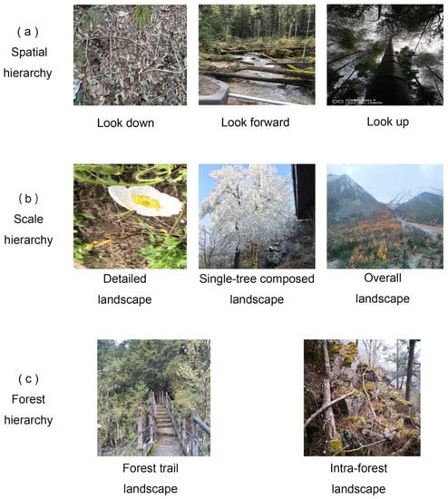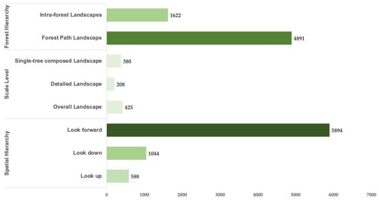 The proportion of forest landscape in the photos taken by people will have a relatively large impact on people’s preferences, and the analysis of the content of the photos can also restore, in a better and more detailed manner, what people appreciate, and can also more accurately describe the landscape [,]. In order to classify the forest landscape photographs taken by tourists, we developed the forest landscape photograph classification for this study based on the characteristics of the dataset and with reference to the forest landscape classification proposed by Chen et al. in 2001 based on forest beauty. Chen et al.’s classification combines both distance and aesthetic object scales to classify forest (plant) landscapes into seven levels—Single-tree Composed Landscapes, Intra-forest Landscape, Forest Trail Landscape, Detailed Landscape, Near, Medium and Far Landscape []. However, during the pre-experiment, we found that it was difficult for machine learning to recognize and judge the near, medium and far views based on the distance between the observer and the aesthetic object, so we then replaced it with look down, look forward and look up, classified according to the vertical foot of the observer and the aesthetic object; the overall view was added to the scale level of the aesthetic object. Therefore, we finally determined 8 forest landscape scenes including: Look Down Landscape, Look Forward Landscape, Look Up Landscape, Single-tree Composed Landscape, Detailed Landscape, Overall Landscape, Forest Trail Landscape and Intra-forest Landscape—8 forest landscape scenes; 3 forest landscape categories, including Spatial Hierarchy, Forest Hierarchy, and Scale Level (See Figure 3). Spatial hierarchy contains Look Down Landscape, Look Forward Landscape and Look Up Landscape. Scale Level includes Single-tree composed Landscape, Detailed Landscape and Overall Landscape. Forest Trail Landscape is a landscape composed of roads and forest stands along the roads; Intra-forest Landscapes are landscapes composed of forest plants in groups rather than single, multiple components rather than single parts, within the forest without the Forest Trail. There are differences between the two. Forest Trail Landscapes and Intra-forest Landscapes are included in the forest hierarchy because they are both non-confined but extensive photographs of forest recreation in the forest interior, and contain more components that distinguish their types from other types.