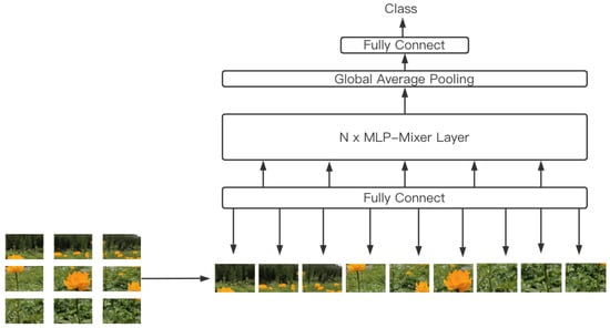 We decided to try the MLP-Mixer model proposed by Google in 2021 for image classification task scene recognition in order to perform a more objective analysis of forest landscape preferences. This is an architecture based only on multilayer perceptron (MLP), which is optimized and has a simpler structure than models such as the convolutional neural network (CNN). The model proposes a mixer structure that first splits the input images into patches, converts each patch into a feature embedding as per-patch fully connected, sends it to N mixer layers, and finally classifies it as fully connected. It uses spatial-mixing MLPs and channel-mixing MLPs to transfer information between different channels and spatial locations (tokens), respectively [,]. These two types of layers are alternately stacked to facilitate the exchange of two input dimensions. Each MLP consists of two fully connected and one GELU. Thus, for Top-1 accuracy on the ImageNet validation set, Mixer achieves a slightly better performance than ResNet and basically the same performance as ViT transformer, and the training speed (img/sec/core) Mixer will be faster than the other two, demonstrating the potential of a simple structure, such as MLP []. Thus, on large-scale datasets, MLP-Mixer achieves a very promising performance that can effectively help us in forest landscape classification. The specific operation example is shown in the Figure 4 and Figure 5.