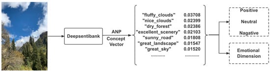 In the era of rapid development of information, people’s impressions of their surroundings will appear more and more on the Internet, and some studies believe that this is a mental conceptualization of people’s relationship with their surroundings []. We study what people capture and their emotions during their forest landscape experiences, which can provide a basis and indicators for forest planning and management [,]. In this study, to explore tourists’ perception of forest landscape images, Deepsentibank, a visual emotion concept classification tool developed by Chen et al. at Columbia University based on deep learning of images (CNN), is utilized. Its development principle is to obtain text tags from web photos, establish the relationship between “adjectives + nouns” used as a basis to identify the content of the images to form emotional keywords, and to transform the image information into textual information []. His method uses over 1 million geotagged photos to train the classifier, composing a total of 2089 APNs (Adjective Noun Paris)—231 adjectives as well as 424 nouns—and thus has a high accuracy. This conceptual-level sentiment analysis can extract the implicit sentiment from the ontology and give us a basis for analyzing the emotional attitude of forest landscape images. The content analysis process is shown in Figure 6 (only the first 7 items are listed in the figure). In this case, the program can parse a forest landscape photo into a set of JSON files possessing ANP sorting, with the top sorted words having high weight and greater relevance to the image.