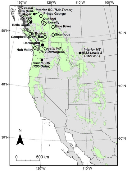 - Gugger, P.F.; Sugita, S. Glacial populations and postglacial migration of Douglas-fir based on fossil pollen and macrofossil evidence. Quat. Sci. Rev. 2010, 29, 2052–2070. [Google Scholar] [CrossRef]