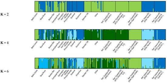 - Falush, D.; Stephens, M.; Pritchard, J.K. Inference of population structure using multilocus genotype data: Linked loci and correlated allele frequencies. Genetics 2003, 164, 1567–1587. [Google Scholar] [CrossRef]