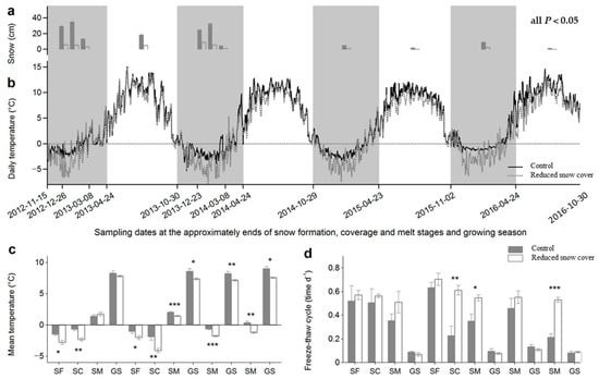 Temperatures and freeze–thaw cycles in the control and reduced snow cover plots. (a) Snow depths (±SE, n = 18) on each sampling date. Differences between control and reduced snow cover plots were significant (p < 0.05) on all sampling dates. (b) Daily temperatures (n = 6) at the litter surface during the four years of decomposition. Sampling dates were scheduled at approximately the ends of the snow formation, coverage and melt stages, and the growing season. Winter times, with the snow formation, coverage and melt stages, are shaded. The dashed line is drawn at a daily temperature of zero. (c) Mean temperatures (±SE, n = 6) at individual stages. Times between two adjacent sampling dates were defined as separate stages to better understand the effect of snow reduction at the snow formation, coverage and melt stages. SF: snow form stage, SC: snow cover stage, SM: snowmelt stage, GS: growing season. (d) Freeze–thaw cycles (±SE, n = 6) at the individual stages. Values were calculated using the quotients of the total number of freeze–thaw cycles and the days of certain stages. * p < 0.05, ** p < 0.01, *** p < 0.001.