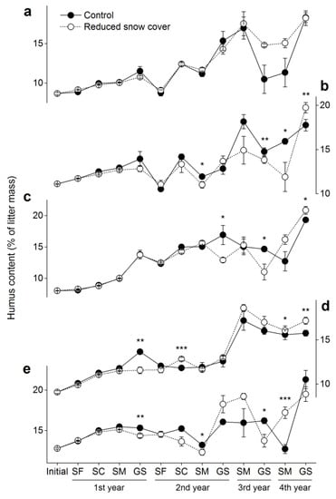 Humus contents (±SE, n = 6) in the five foliar litters. (a) Cypress, (b) larch, (c) birch, (d) willow and (e) azalea. SF: snow formation stage, SC: snow cover stage, SM: snowmelt stage, GS: growing season. * p < 0.05, ** p < 0.01, *** p < 0.001.