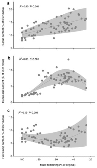 Relationships between the remaining mass and humus contents (a), humuc acid contents (b) and fulvic acid contents (c). Shaded areas are 95% confidence intervals. Adjusted R2 and p-values from linear or exponential regressions are shown in each panel (all n = 78).