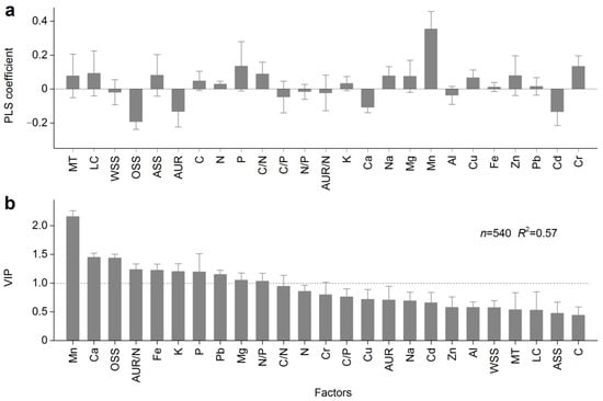 Partial least squares (PLS) analysis results for testing factors that impacted the humus content. (a) PLS coefficient. (b) Variable importance of projection (VIP). Error bars represent standard errors. VIP values greater than 1 (above the dashed line) were significant. MT: mean temperature, LC: labile carbon, WSS: water-soluble substances, OSS: organic-soluble substances, ASS: acid-soluble substances, AUR: acid-unhydrolyzable residue, C: carbon: N: nitrogen, P: phosphorus, K: potassium, Ca: calcium, Na: sodium, Mg: magnesium, Mn: manganese, Al: aluminum, Cu: copper, Fe: iron, Zn: zinc, Pb: lead, Cd: cadmium, Cr: chromium. All these factors were monitored in our long-term experiment.